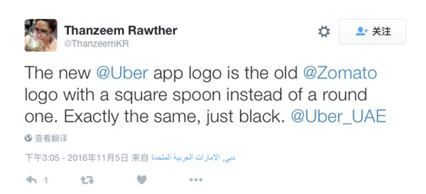 Thanzeem Rawther:uber的新logo和食譜網(wǎng)站Zomato的舊Logo完全一樣,就是把圓勺子換成了方勺子。