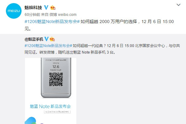 魅族今年可謂是一直忙著開發布會,前幾天,魅族剛宣布將于11月30日舉辦發布會,現在魅族再次發出邀請函,宣布魅族將在12月6日下午3點于國家會議中心舉行魅藍Note新品發布會,主題“如何超越一代經典”。