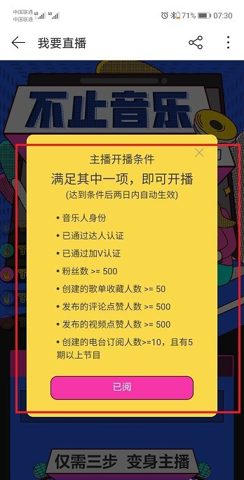 第一步我們首先需要知道網易云音樂開通直播需要滿足的條件,音樂人身份,達人認證等任何一項都可以,如下圖所示: