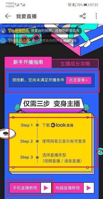 第四步進去之后,可以看到是否滿足直播條件,如果滿足的話,點擊手機直播教程或者電腦直播教程,如下圖所示: