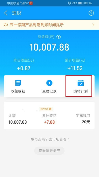第一步手機上打開支付寶,進去財富界面,點擊理財,選擇攢錢計劃