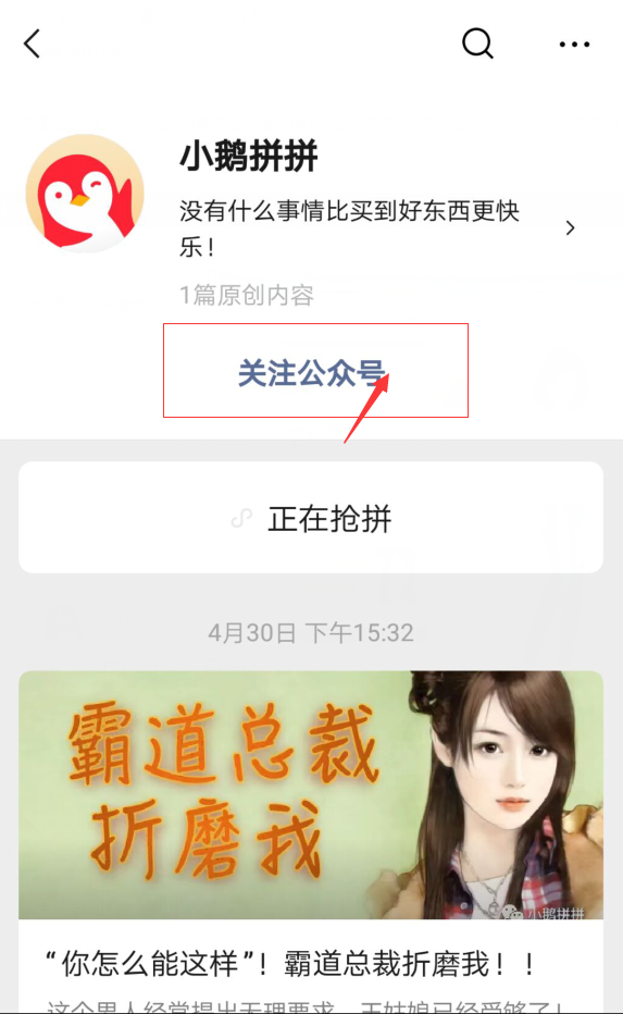第一步:微信搜索“小鵝拼拼”公眾號(hào),點(diǎn)擊關(guān)注。