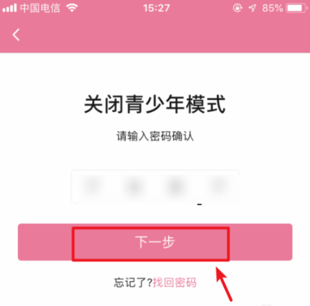 點(diǎn)擊進(jìn)入關(guān)閉界面,在頁(yè)面中輸入青少年模式的密碼,點(diǎn)擊下一步。
