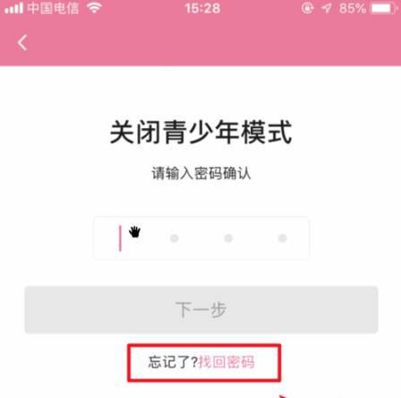 如果忘記了青少年模式的密碼,也可以輸入密碼的界面,點(diǎn)擊下方的忘記密碼。