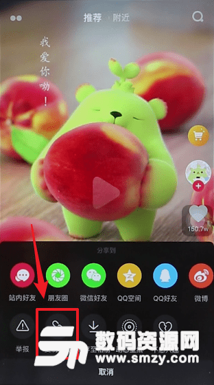 1、在抖音短視頻App首頁點擊視頻右側的【分享】按鈕;