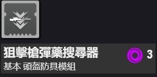 韌性模組以及狙擊槍彈藥搜尋器,因為你的劍狙需要這個,劍狙哪怕是帶了備彈模組最終也只是多出一發(fā)額外的X4傷害子彈而已,每一槍滿傷害都會消耗4顆子彈,你原本劍狙的備單只夠打出5顆滿傷害的子彈,所以彈藥搜尋器是需要的。