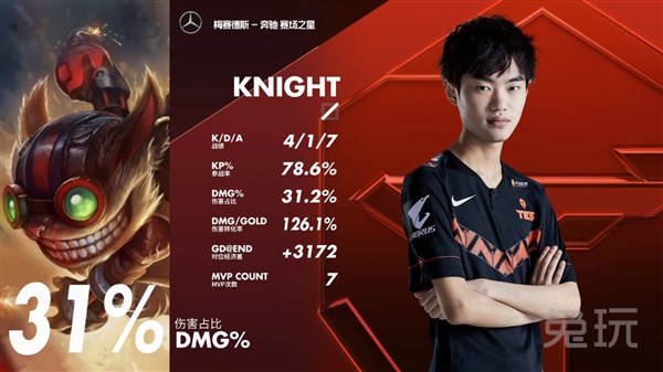 而且通過賽后數據觀察我們發現,Knight這一場炸彈人的加點是主Q副W,而不是主流的主Q副E打法,目的就是放棄E的控場與傷害,追求更快的拆塔能力。