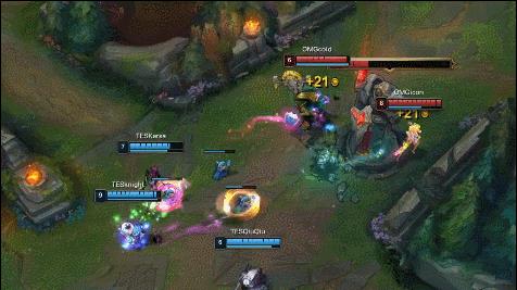 比賽中可以多次看到TES戰隊抱團消耗防御塔的局面,TES在中期之后就一直在避戰,然后靈活地轉線來形成對防御塔的攻勢,在推塔之前先POKE,同時抓機會打下路組合的控制鏈先手配合炸彈人大招抓先手減員的機會。
