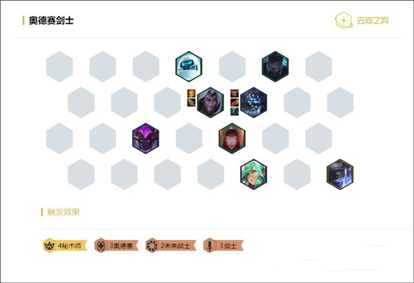 選秀優先拿反曲弓和大劍,防御裝備不需要刻意去拿很好湊。前期先上3奧德賽搭配劍士,等到劍士來了把裝備直接給劍圣,多的裝備給亞索,湊出3奧德賽3劍士2未來戰士。前期沒有高費的棋子,把經濟全部用在提升劍圣和亞索的星級上,等到后期再上4秘術對抗其他陣容。如果先來了錘石就用4未來戰士給劍士們加攻速。
