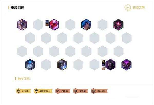 【重裝狙神】是一個非常冷門的陣容,10.7版本才被開發出來,10.8也是強度僅次于星守女團和暗星的T2級陣容。靠著4重裝可以很好的過渡到狙神發力的后期。