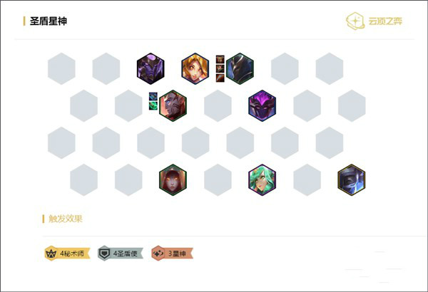 裝備優先拿鎖子甲和魔抗斗篷,在選秀中這些一般都沒有人要,先給趙信準備防御裝備。前期可以適當的擺爛,只要能夠打贏野怪就行,因為圣盾需要4人才能成型。等到5人口開始適當的D一波找趙信、洛和妮蔻,上皇子組成4圣盾,再搭配其他的秘術棋子。中期盡量提升低費棋子的星級打連勝,拉到8人口上璐璐組成4秘術組合,能夠有效的各路法師陣容。走星守的人太多那就把秘術羈絆換成星神,上霞、卡薩丁和艾希,6星神同樣有一戰之力。