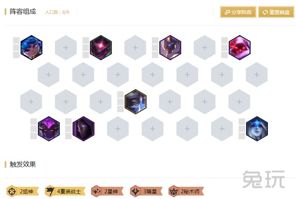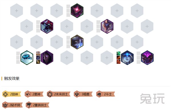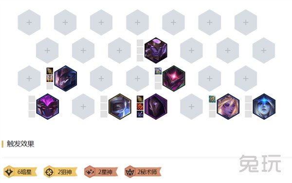 簡析 :10.7版本暗星重做,一個暗星英雄倒下,全體暗星英雄都會得到提升。所以6暗星能最大程度的提升存活下來的棋子強度。另外搭配星神和秘術羈絆,給到全體一定的續航能力和魔抗能力,防止全體殘血被秒。