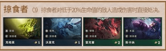在介紹這個玩法之前,先給大家介紹一下掠食者的羈絆屬性,不同于LOL游戲中加移動速度的效果,在云頂之弈中,掠食者的效果是,當掠食者攻擊低于25%血量的對手時會直接秒殺。