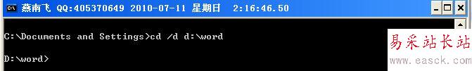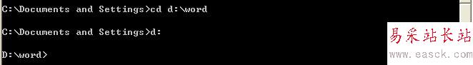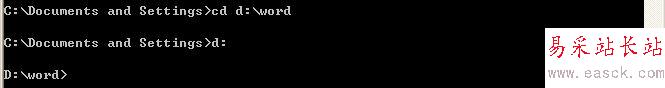 例7、如果當前目錄是C:/Documents and Settings 要切換到 d:/word 在命令行輸入cd d:/word回車后再輸入d: 如下圖