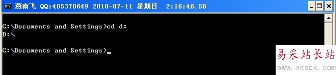 例4、如果想改變當前驅動器的目錄c:/documents and settings,進入到d驅動器默認目錄,在當前命令行輸入d: 執行后結果如下圖