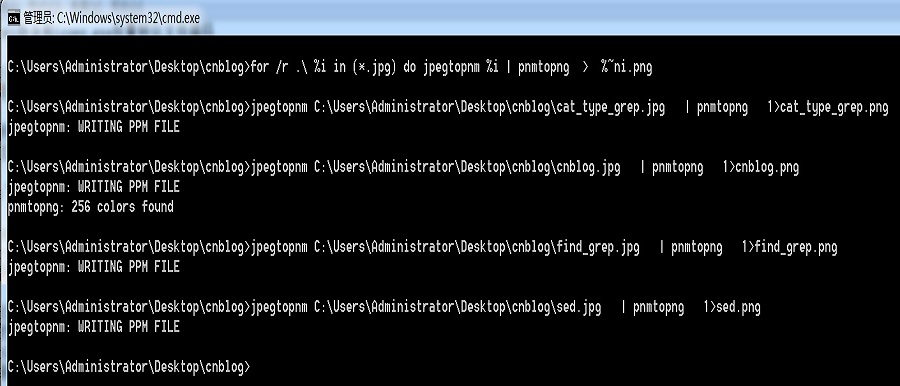 8. 批量轉化圖片:for /r ./ %i in (*.jpg) do jpegtopnm %i | pnmtopng > %~ni.png