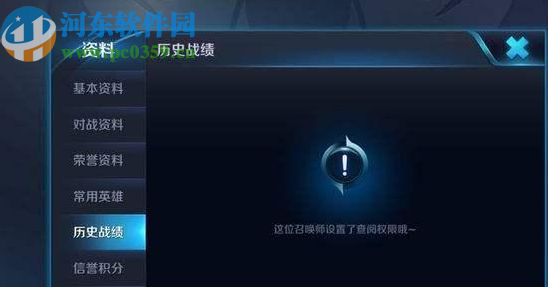 4.當(dāng)我們關(guān)閉戰(zhàn)績顯示功能之后,別人點(diǎn)擊查看我們的戰(zhàn)績時(shí)就會(huì)顯示下圖所示的界面了,表示“這位召喚師設(shè)置了戰(zhàn)績查閱權(quán)限”。