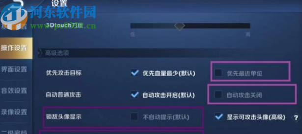 4.之后我們向下滑動界面,在高級選項中就可以看到優先攻擊目標這個功能設置了,我們可以選擇勾選“優先血量最少”和“優先最近單位”這兩個選項的其中之一。