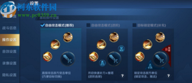 3.點擊切換到操作設置界面之后我們可以先選擇自己想要使用的攻擊模式,有下圖所示的三種攻擊模式可以選擇。