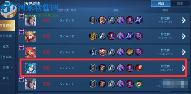 3.切換到歷史戰(zhàn)績之后我們就可以看到自己排位的對局情況了,然后找到想要查看排位隊友資料的那一個對局當(dāng)中。
