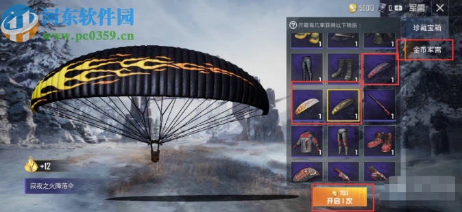 3.另外一種方法我們可以在游戲的軍需界面中通過用金幣來開箱子獲得降落傘皮膚,金幣可以通過玩游戲獲得,在軍需界面中可以看到有機會獲得的降落傘皮膚款式。