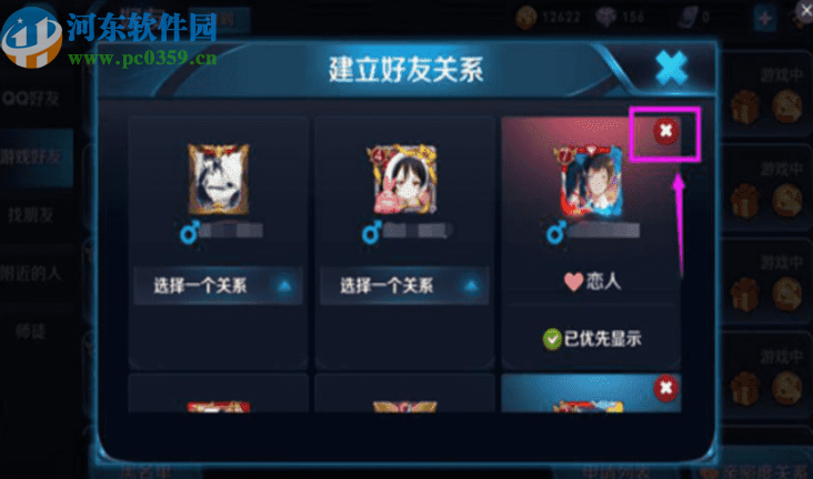 3.點擊親密度關系按鈕之后就可以查看我們的親密度關系有哪些了,然后找到戀人關系之后點擊右上角的紅色叉叉。