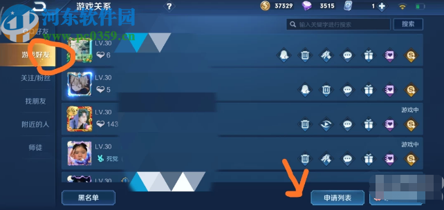 2.點(diǎn)擊這個(gè)好友圖標(biāo)之后,我們?cè)诔霈F(xiàn)的界面左側(cè)切換到游戲好友這個(gè)功能模塊,然后再點(diǎn)擊界面中的申請(qǐng)列表這個(gè)功能按鈕。