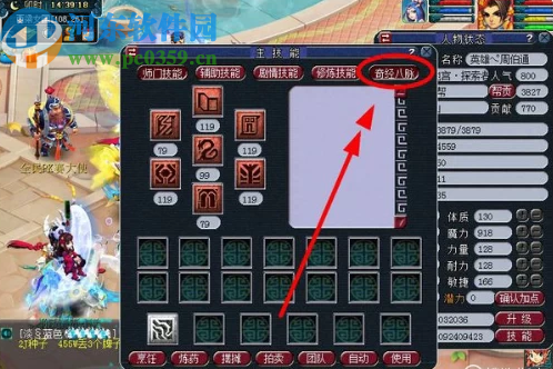 1.首先第一步我們登錄游戲之后,在游戲界面中打開屬性面板中的技能按鈕,然后在主技能面板中找到右上角的奇經八脈,緊接著點擊進去。