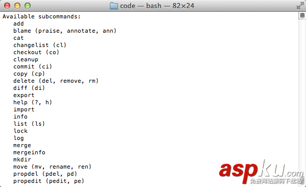 這里列出一大堆svn指令,后面括號中的內容的一般代表著指令的簡稱,比如我們可以用svn ci代替svn commit,用svn co代替svn checkout