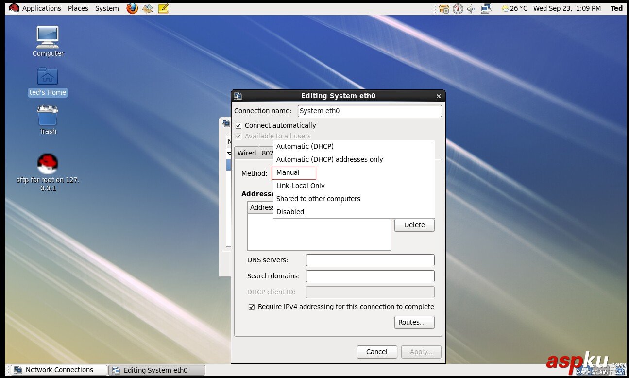 默認的網絡連接方式為DHCP,現將其改為手動Manual(需要先了解整個網絡段及網關,如圖4)