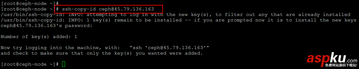 在 ceph-node 運行下面的命令復制它的 ssh 密鑰到 ceph-storage。