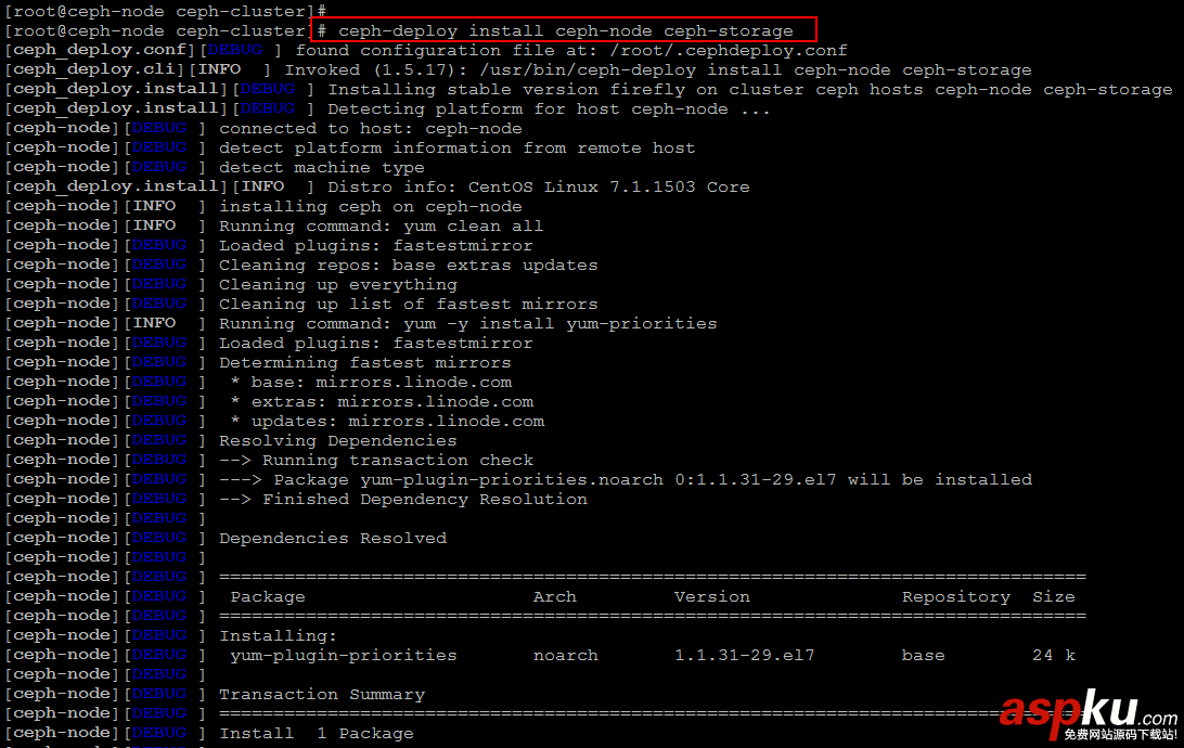 現在我們準備在和 Ceph 集群關聯的每個節點上安裝 Ceph。我們使用下面的命令在 ceph-storage 和 ceph-node 上安裝 Ceph。