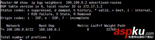 Router-A# show ip bgp neighbors 100.100.0.2 advertised-routes