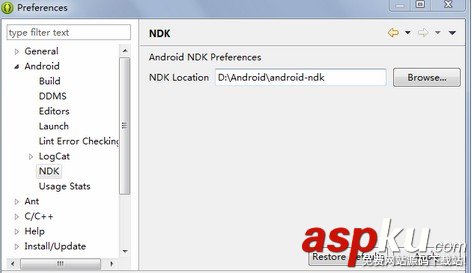在eclipse中點擊菜單欄window-Perferences,配置NDK的路徑。