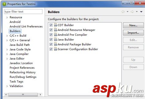 如果工程里面已經有jni目錄了,但是沒有配置C/C++的編譯器,高手們可以自己添加Builder,對于我這種愛投機取巧的小菜鳥,工程右鍵菜單,新添加一個空白的so,然后再刪除,CDT Builder和Scanner Configuration Builder就出來了。