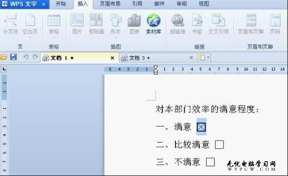 說做就做,先打開WPS文字2012,待將要進行問詢的內容輸入完成后,將光標定位到要進行選擇的答案后面,在菜單欄中單擊“插入”選項卡,然后在“窗體”功能區中單擊“復選框型窗體域”按鈕(如圖1),待插入完成后再單擊“窗體域底紋”命令將窗體域底紋取消,最后單擊“保護窗體域”按鈕。這樣,當我們用鼠標點擊復選框時,即可在選中、未選中狀態中切換了(如圖2)。