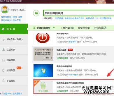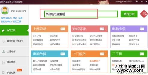 打開人工服務,輸入:關機后電腦重啟,搜索解決方案。