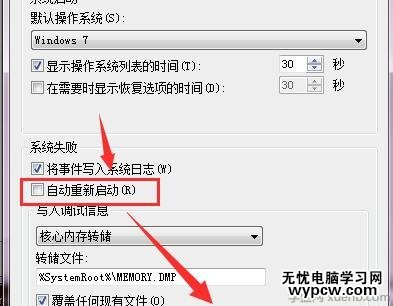 打開啟動和故障恢復項目下的設置,勾選掉系統失敗項目下的自動重新啟動前面的勾,點擊確定關閉選項卡。