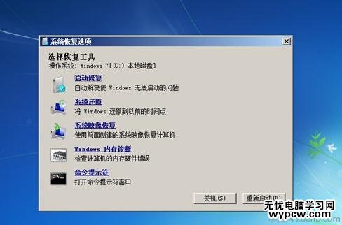 4、 輸入確定后將會進入的是系統恢復選項,在這個界面我們可以看到“啟動修復”選項,這就是我們現在需要的。如果你有其他需要,也可進行其他選項的操作。