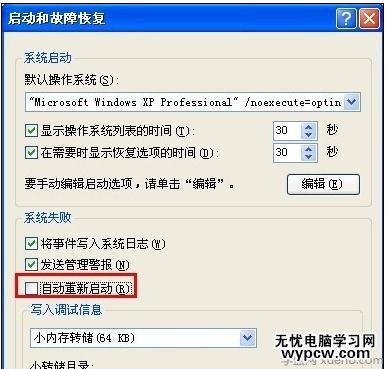 在系統失敗選項下將“自動重新啟動”的復選框去掉,然后一路單擊“確定”按鈕使設置生效。