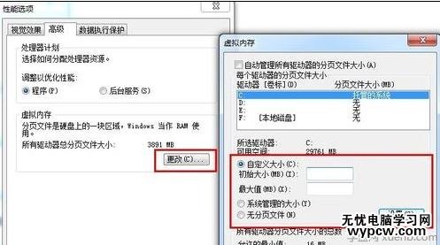 4)在“性能選項”窗口的“高級”選項卡中,有個虛擬內存,然后點擊“更改”,選定自定義,然后進行虛擬內容的擴大,只要在符合容量要求內均可,但是也不宜過大。