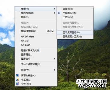 若是我們想不顯示桌面點圖標,那么可以按照相反的方法,桌面空白處點擊右鍵,然后點擊查看菜單,之后去掉“顯示桌面圖標”的勾選