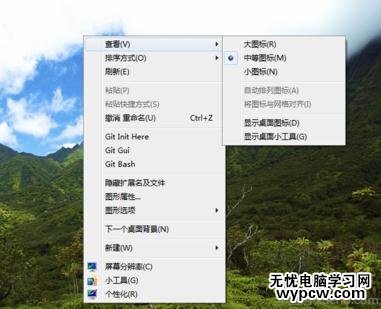 鼠標點擊或者移動鼠標到“查看”菜單上,之后會在右邊打開查看的子菜單,細心的朋友可能已經發現了“顯示桌面圖標”的選項