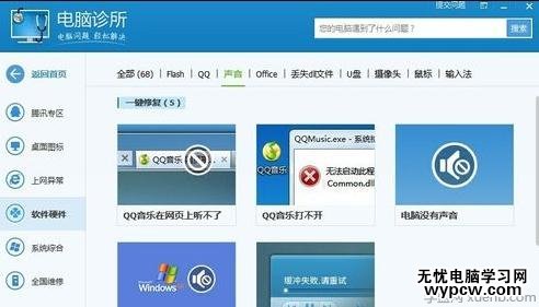 2 進入到騰訊電腦管家的電腦診所中的硬件問題后,找到相關的電腦沒有聲音功能選項,點擊進入后修復即可。