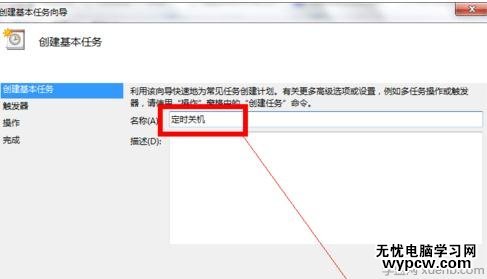 名稱欄目,輸入“定時關機”,下一步