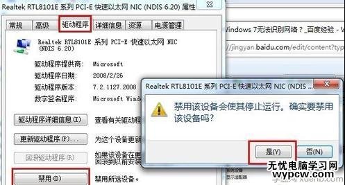 切換到“驅(qū)動(dòng)程序”標(biāo)簽,點(diǎn)擊“禁用”,彈出禁用該設(shè)備會(huì)使其停止運(yùn)行的對(duì)話框,點(diǎn)擊“是”按鈕