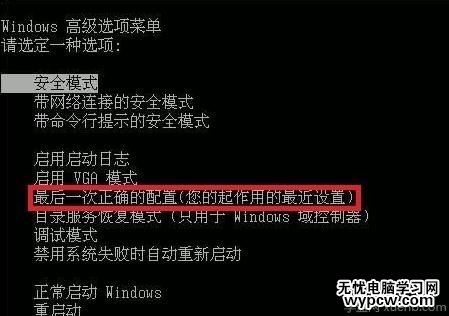 第一種解決方案,在開(kāi)機(jī)時(shí)按下F8鍵,進(jìn)入電腦的安全模式,選擇“最后一次正確的配置”,即可;