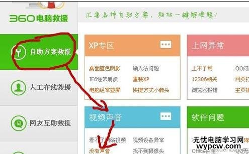進入電腦救援主界面后,找到自助方案救援—視頻聲音—沒有聲音