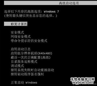 1、 在win7電腦進入不了系統時,大家首先重啟電腦,在重啟電腦的時候狂按F8鍵進入系統安全模式。如果是筆記本電腦沒有重啟鍵,那么就長按電源鍵強制關機,然后再重新開機。