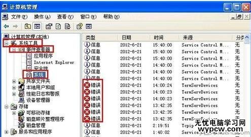 打開“計算機管理”,在控制臺樹窗口單擊系統工具下的“事件查看器”——“系統”,這時我們會看到類型為“錯誤”的事件,打開來看看有沒有記錄關鍵的消息